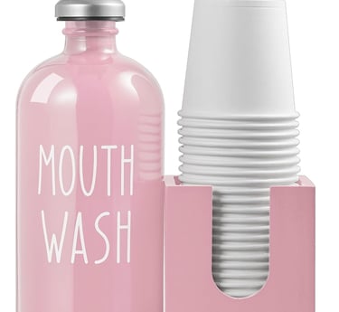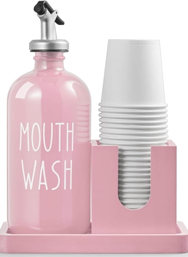 2. Luxe Up Your Vanity with a Pink Glass Mouthwash Dispenser 🥂