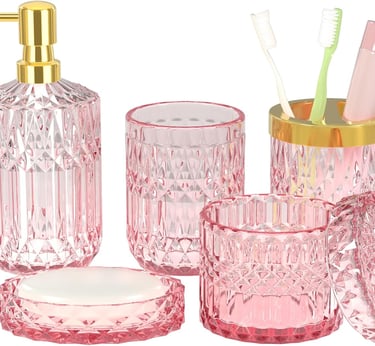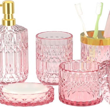 A coordinated set is the easiest way to elevate your bathroom decor. This Pink Bathroom Accessories Set includes a soap dispenser, soap dish, toothbrush holder, tumbler, and cotton swab jar.