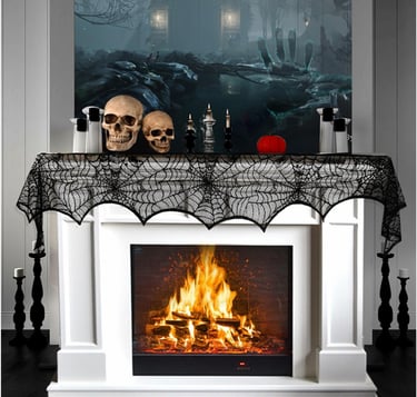To complement your pillows, drape a Halloween Cobweb Fireplace Scarf across your mantle or side table. Its black lace spiderweb design instantly adds a spooky backdrop for your candles, pumpkins, and other seasonal décor.